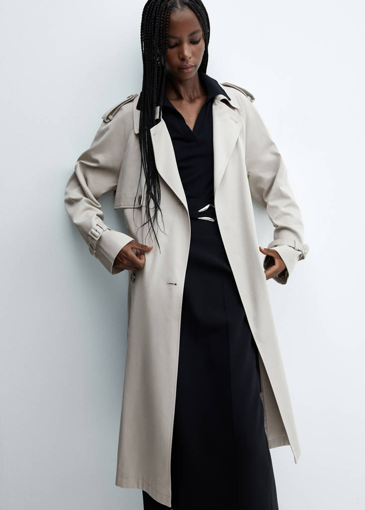 Teixit fluid. Disseny llarg. Disseny recte. Coll pic amb solapa. Solapes amb cran. Màniga llarga. Trabelins. Tancament de llaç. Dues butxaques laterals. Obertura posterior als baixos. Folre interior. El color marró és exclusiu online. Looks d'oficina. Water Repellent: L'acabat durador d'aquesta peça protegeix de la pluja lleugera, repel·lint el contacte amb l'aigua i les gotes de pluja