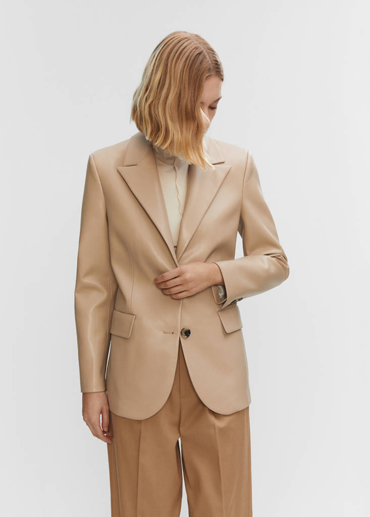 Efecte pell. Disseny entallat. Coll pic amb solapa. Solapes amb trau. Màniga llarga amb punys botonats. Tanca de dos botons a la part davantera. Dues butxaques de solapa a la part frontal. Muscleres. Detall de pinces. Folre interior. El color marró mig és exclusiu online