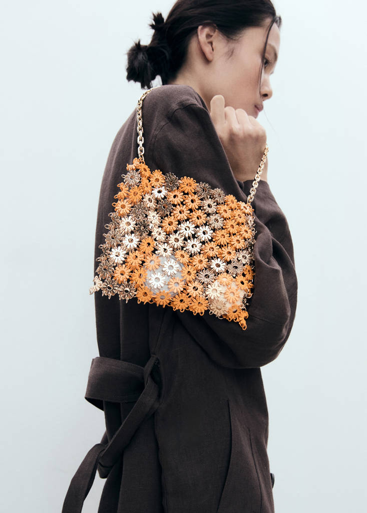 Mida petita. Nansa d'espatlla. Nansa curta de cadena. Disseny de flors. Disseny metàl·lic. Sense tancament
