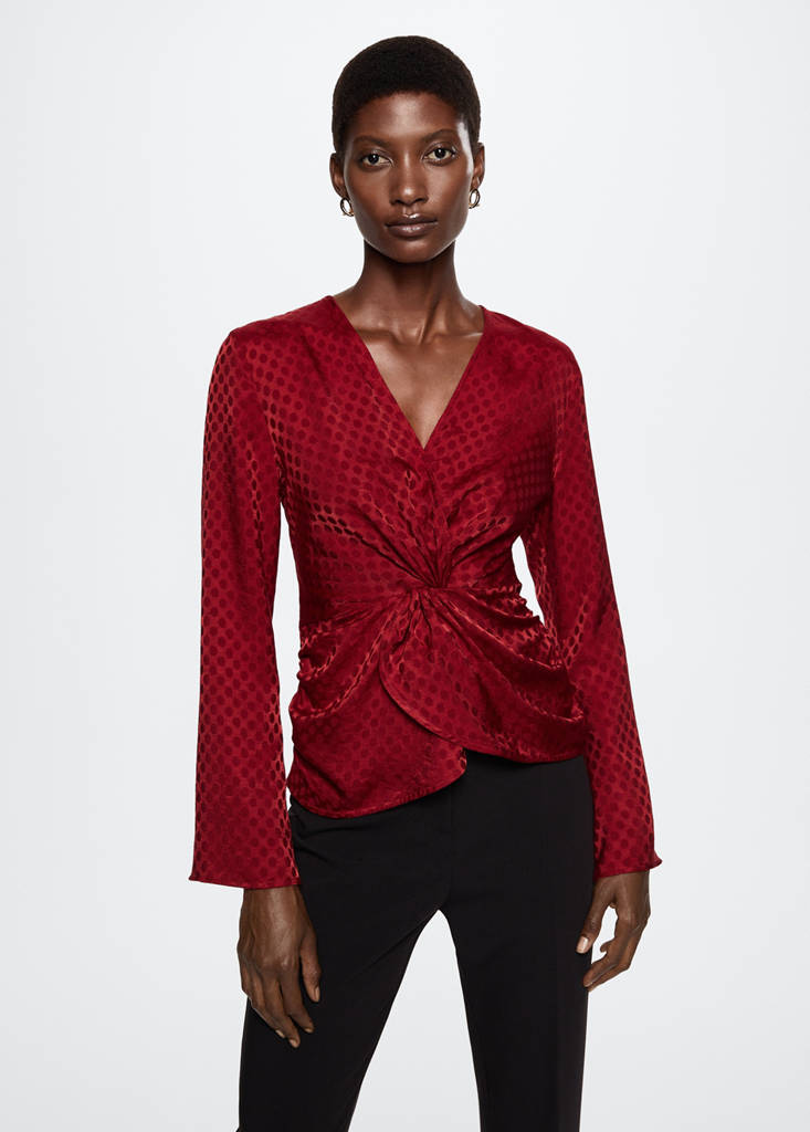 Teixit setinat. Teixit fluid amb textura. Disseny entallat. Escot en punta creuat amb tanca oculta de botó. Màniga llarga acampanada. Detall nus. Detall frunzit als laterals. Col·lecció festa i cerimònia