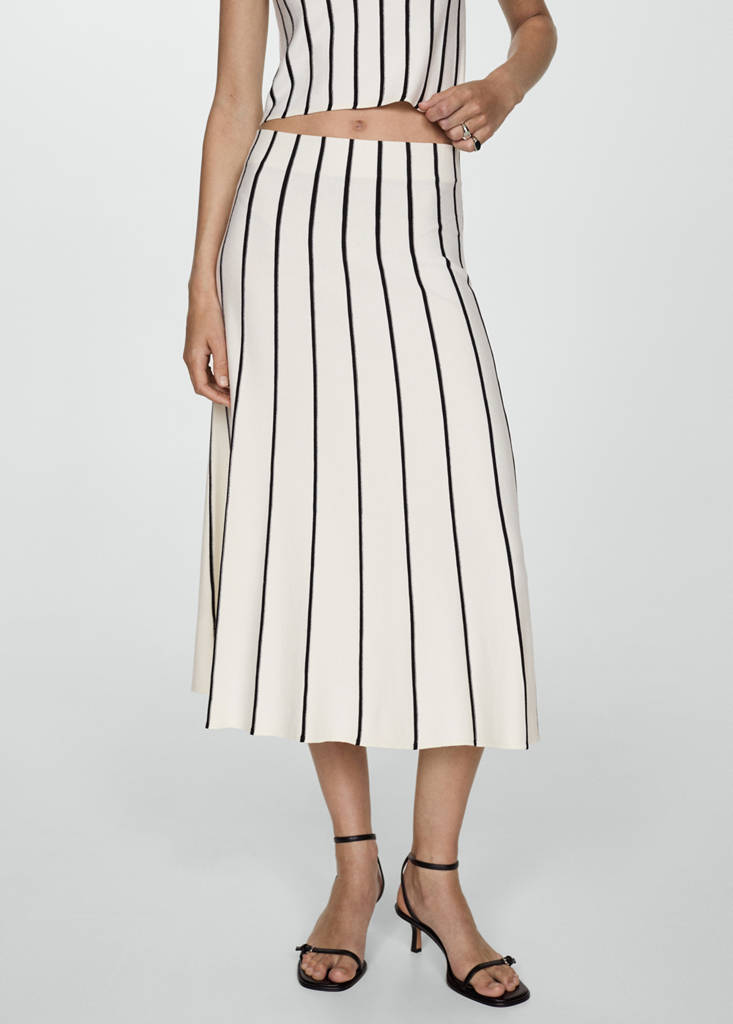Teixit de punt fi. Disseny midi. Disseny recte. Cintura amb goma elàstica. Sense tancament. Total look. Disseny de ratlles