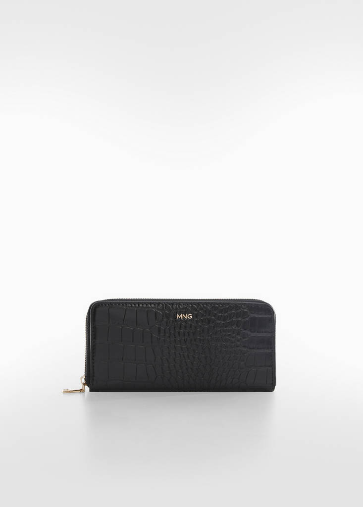 Mida gran, efecte cocodril, butxaca interior de cremallera, múltiples ranures per a targetes, tanca de cremallera, logotip en relleu, folre interior.