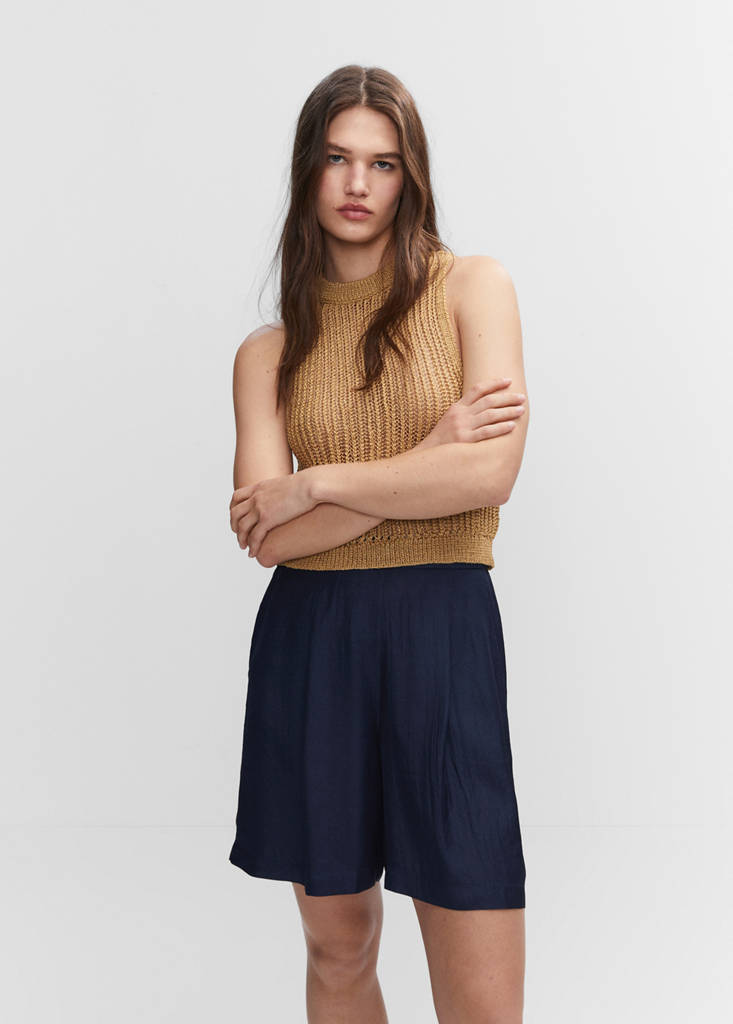Teixit fluid. Disseny recte. Dues butxaques laterals. Cintura amb goma elàstica. Sense tanca. Disponible Plus