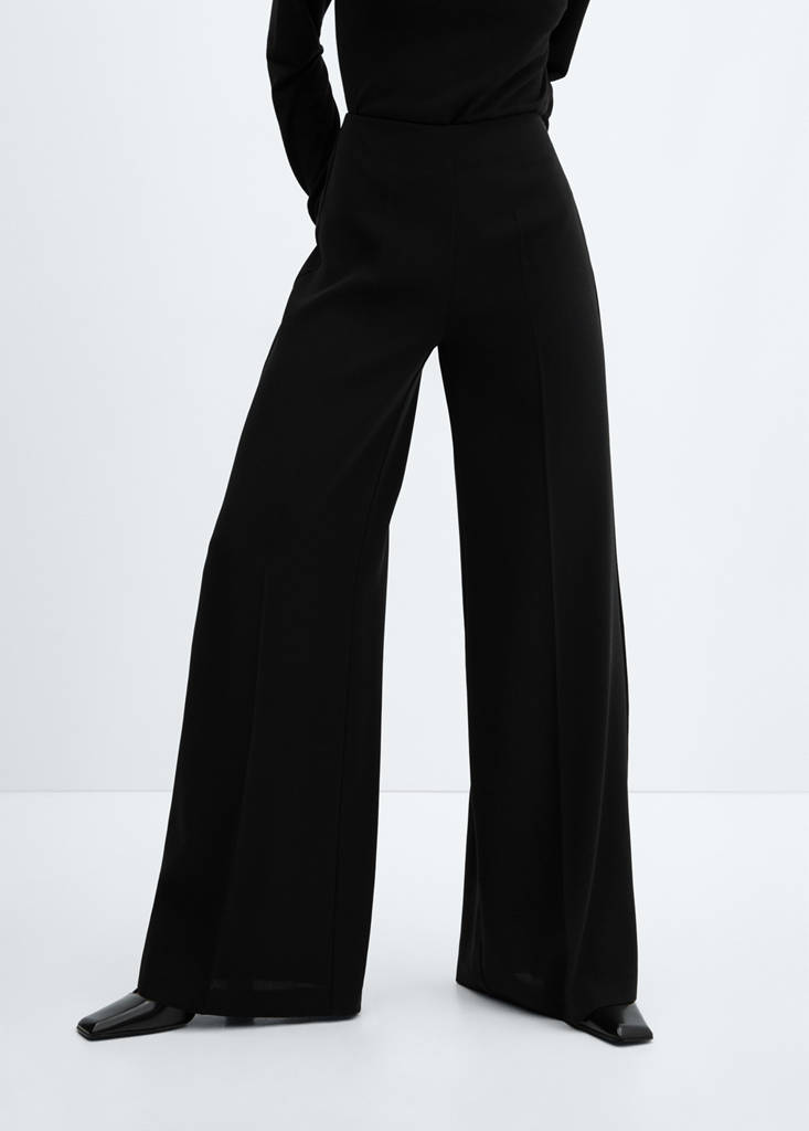 Disseny llarg. Llargada llarga. Disseny palazzo. Tir cintura High Waist. Silueta Palazzo. Teixit fluid. Disseny recte. Tir mitjà. Detall de pinces. Tanca oculta de cremallera lateral. Col·lecció festa, cerimònia i comunió. Looks d'oficina. Tir alt