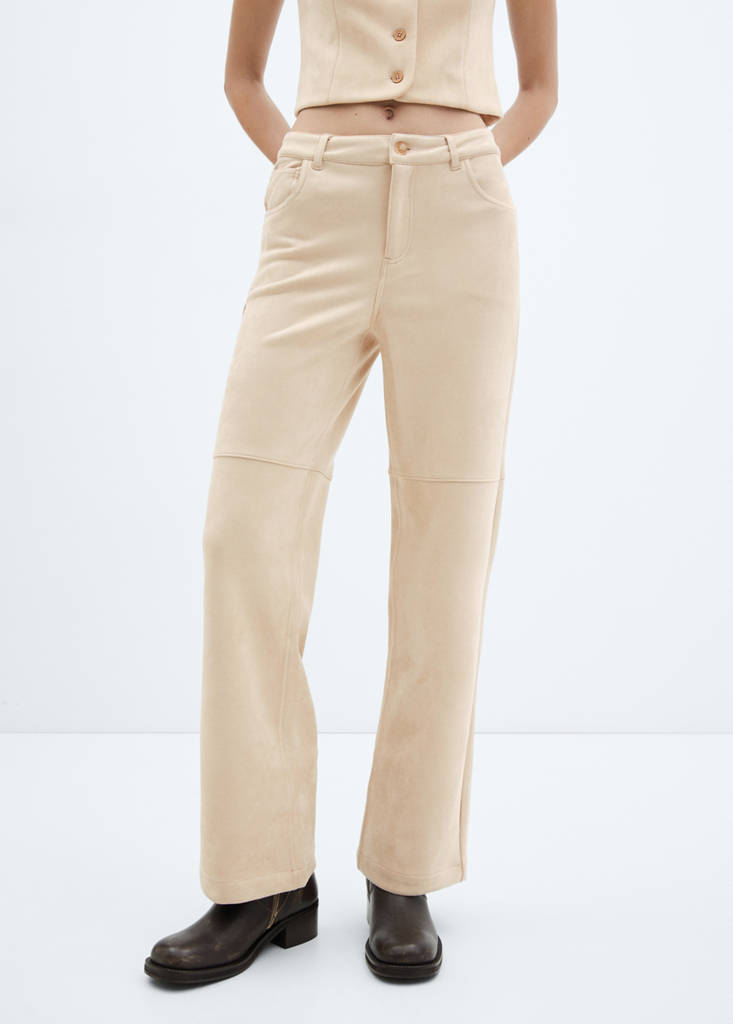 Efecte pell girada. Disseny llarg. Disseny recte. Dues butxaques laterals. Dos butxaques de pedaç a la part posterior. Tancament de cremallera i botó. Trabelins. Costures decoratives. Total look