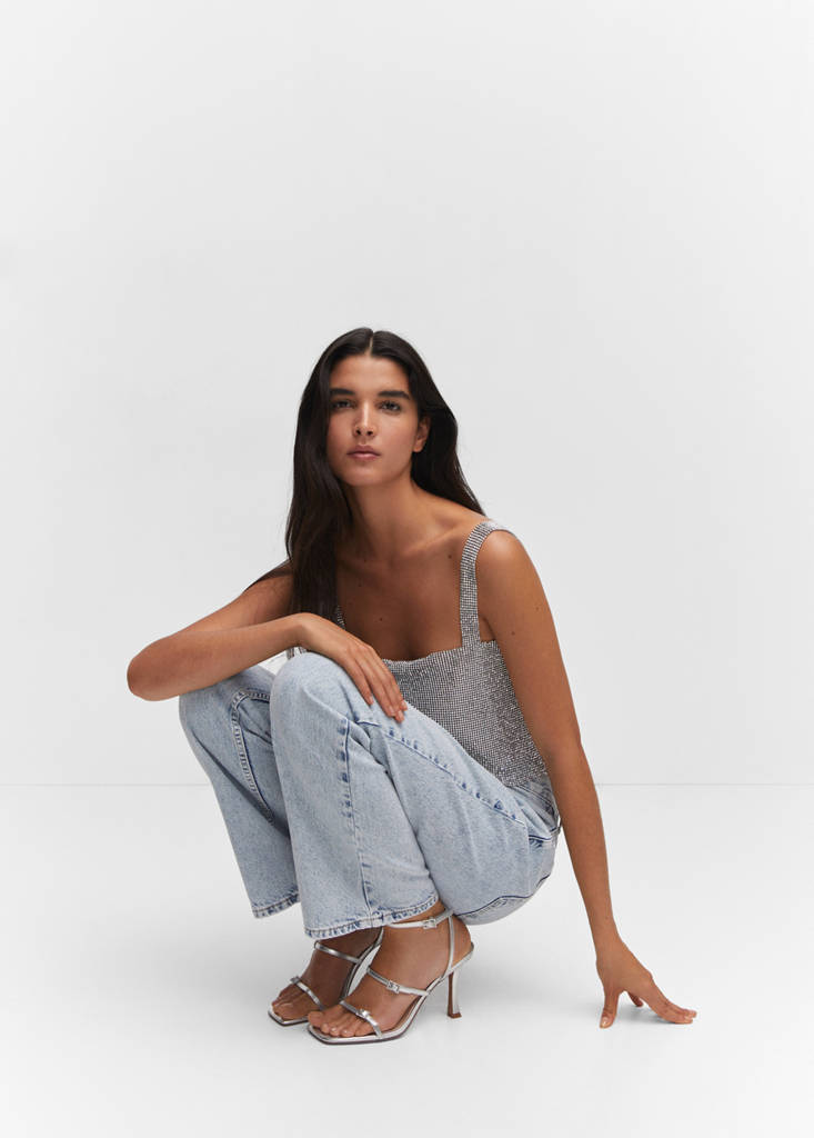 Efecte metal·litzat. Punta quadrada. Tacó embut. Polsera al turmell. Tancament de sivella. Sivelles decoratives. El taló mesura 8,5 cm. Col·lecció festa, cerimònia i comunió