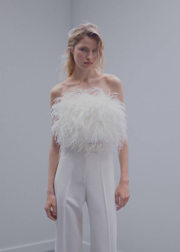Aquesta peça estil bandó de plomes aporta sofisticació, però alhora un toc divertit, rejovenidor i diferent. Aconsegueix un resultat d'impacte amb el total look a conjunt. Teixit amb acabat de plomes. Disseny bandeau. Disseny crop. Sense mànigues. Paraula d'honor. Tancament de cremallera a la part posterior. Confeccionat al Marroc. Aquesta peça conté cremallera de cotilleria amb tancat especial. Aconsellem vaporitzar la peça el menys possible, ja que es distribueix planxada. Col·lecció festa, cerimònia i comunió. Els articles de la col·lecció CAPSULE es poden canviar o retornar en un termini de 14 dies des de la data d'enviament. Aquesta peça pertany a la nostra col·lecció d'esdeveniments, dissenyada per convertir-te en la convidada perfecta en qualsevol festa, casament o cerimònia