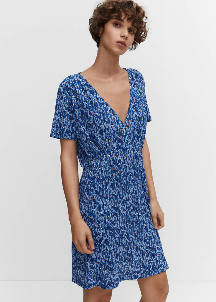 Teixit fluid. Teixit amb textura. Disseny evasé. Disseny curt. Disseny estampat. Coll punta. Màniga curta. Sense tanca. Disponible Plus