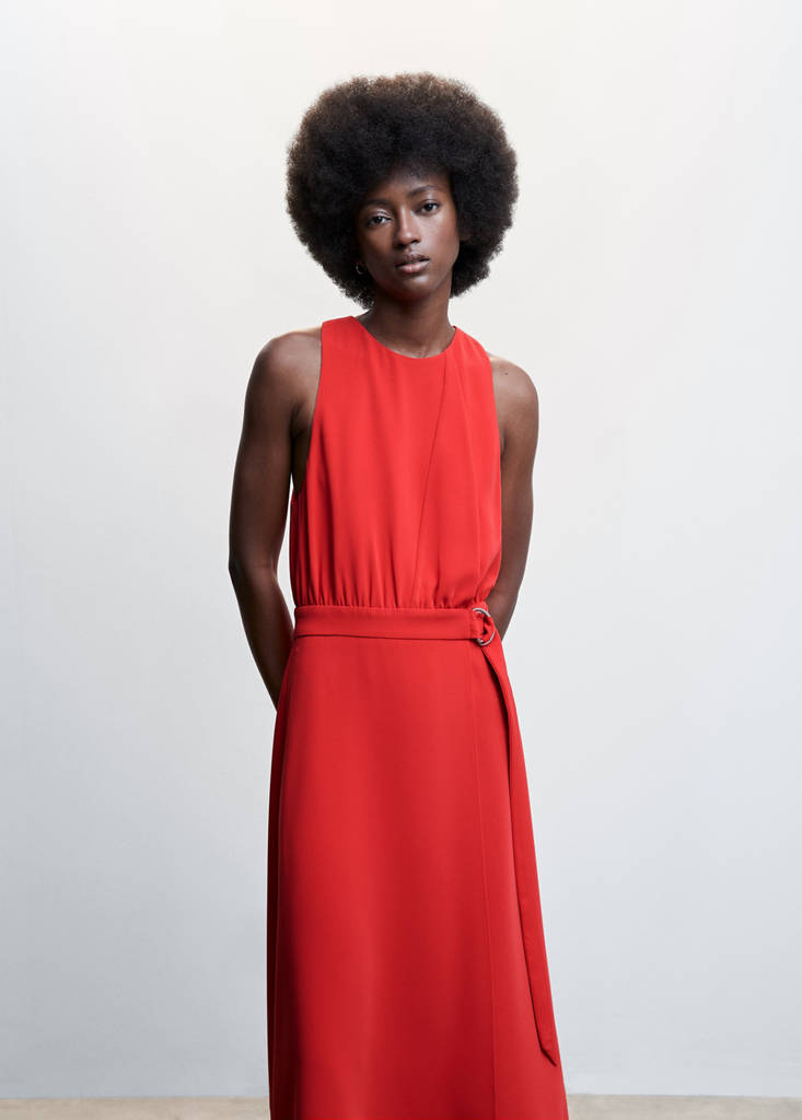 Teixit fluid. Disseny midi. Disseny evasé. Coll rodó. Sense mànigues. Tanca de cremallera invisible a la part posterior. Cinturó ajustable. Folre interior. Col·lecció festa i cerimònia