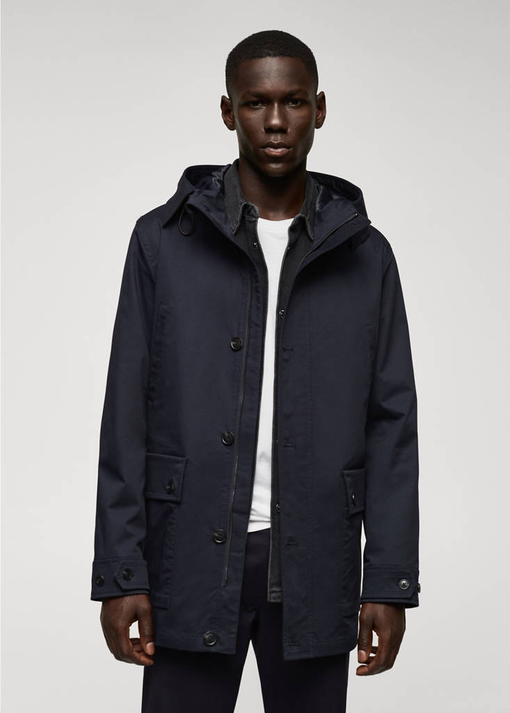 Regular fit, teixit barreja de cotó, amb caputxa, tanca de cremallera i botons, dues butxaques de rivet laterals, dues butxaques de solapa amb botó a la part davantera, màniga llarga amb travetes ajustables , vora recta, folre interior, butxaca interior, el model mesura 190 cm i porta una talla M.