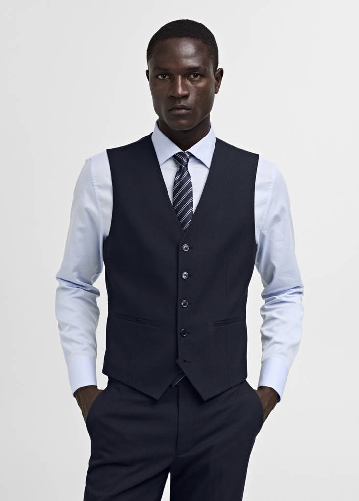 Slim fit. Confeccionat de polièster reciclat, una fibra resistent, transpirable i de fàcil cura, que aporta comoditat en l'ús. Comfort Stretch: Teixit elàstic que aporta un plus de comoditat. Coll en punta. Sense mànigues. Sivella ajustable a l'esquena. Folre interior. Butxaca interior. Col·lecció sastreria. Dues butxaques de rivet a la part davantera. Tancament davanter amb botons. Comfort: Aquesta peça li ofereix total llibertat de moviments i recupera la seva forma original