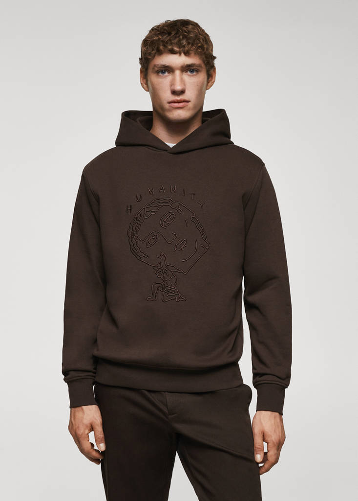 En col·laboració amb l'artista Tiago Majuelos, teixit barreja de cotó, slim fit, amb caputxa, dibuix brodat al pit, coll rodó, màniga llarga amb punys elàstics, vora recta, el model mesura 190 cm i porta una talla M.