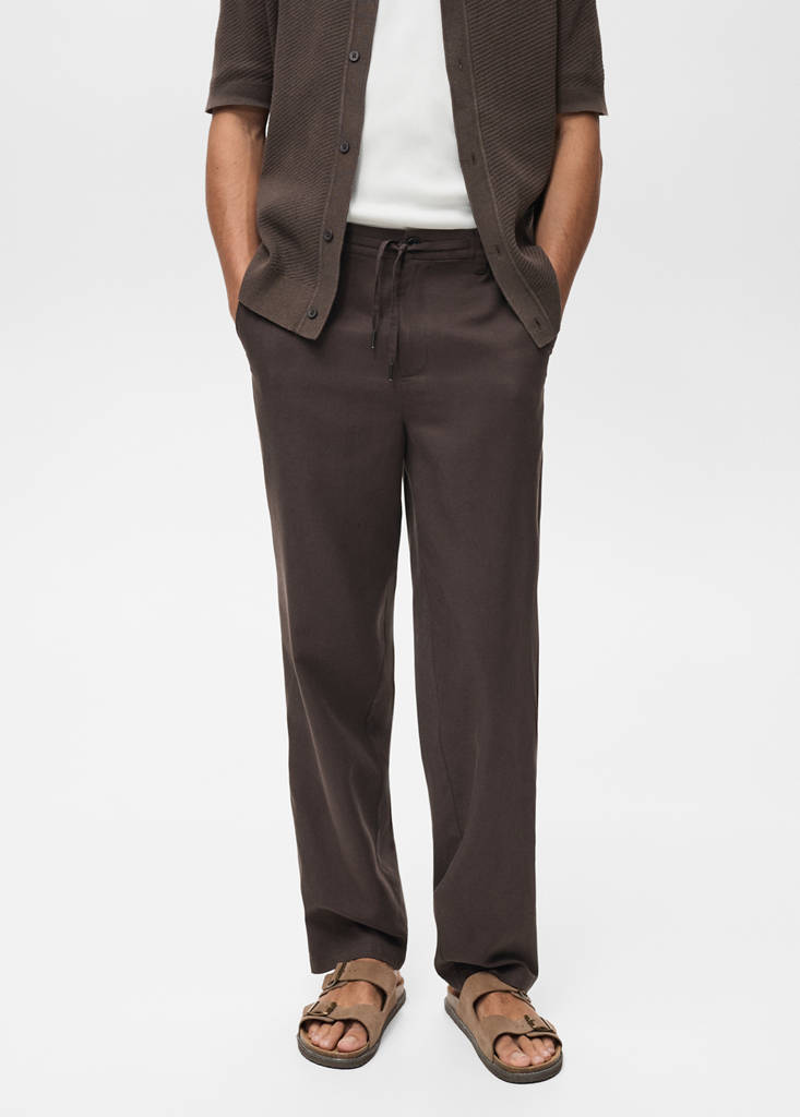 Tall recte. Teixit de viscosa, lli i cotó. Travetes per a cinturó. Tancament de doble botó i cremallera. Tanca de cordill ajustable. Dues butxaques laterals