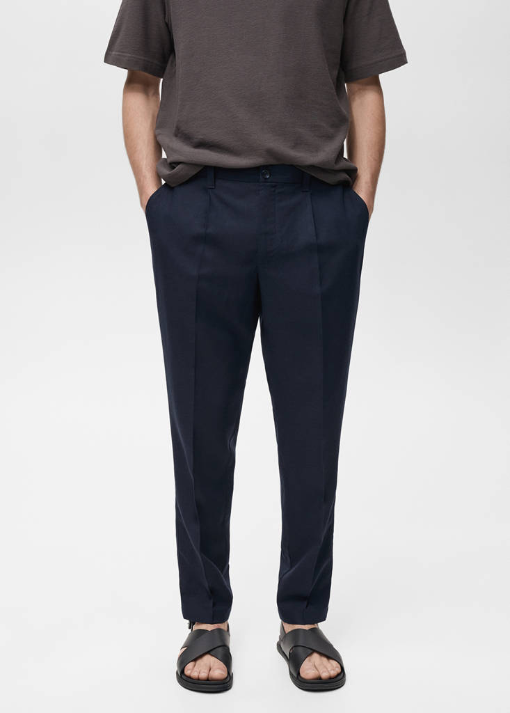 Regular fit. Teixit barreja de lli i lyocell. Travetes per a cinturó. Tancament de botó i cremallera. Detall de ratlla planxada a la part del davant i del darrere. Dues butxaques laterals. Dos butxaques de trau amb botó a la part posterior