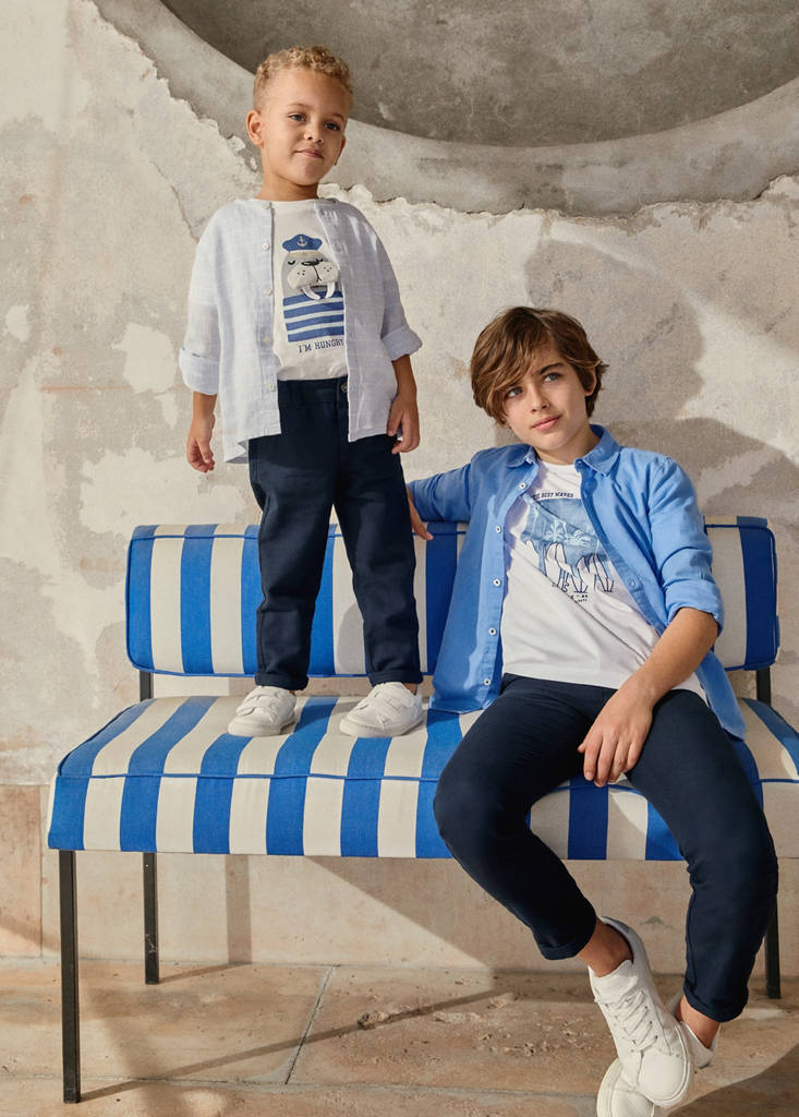 Teixit de cotó. Teixit de lli. Estampat de ratlles. Coll mao. Màniga llarga. Tanca davantera amb botons