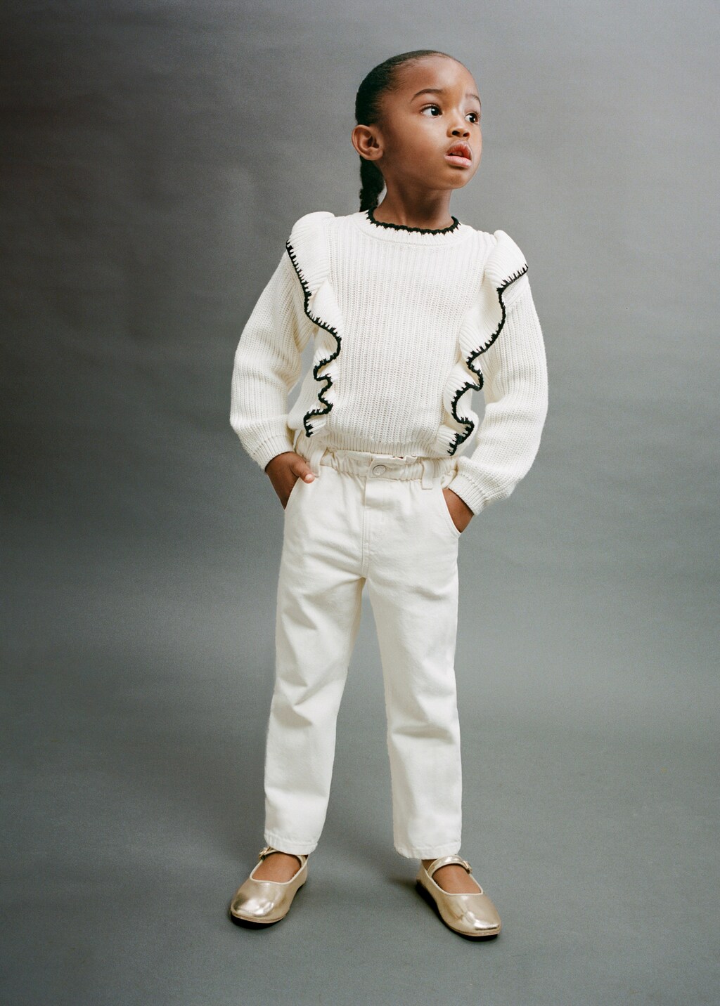Teixit de cotó estil texà vaquer. Silueta Paperbag. Disseny recte. Disseny llarg. Dues butxaques laterals. Dos butxaques de pedaç a la part posterior. Cintura amb goma elàstica. Trabelins. Tanca d'un botó.