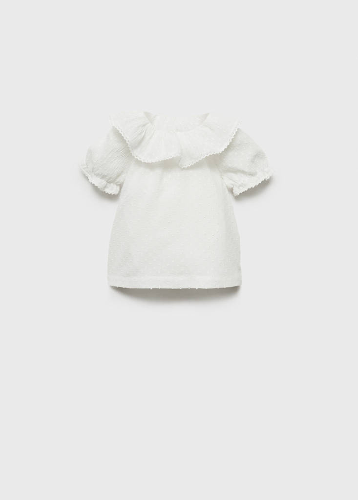 100% cotó. Teixit plumeti. Màniga curta. Coll babydoll. Tancament de botons. Detalls de puntilla