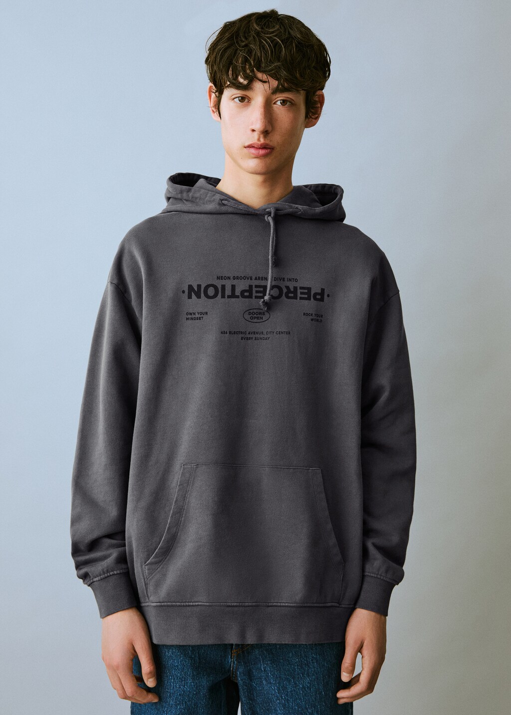 100% Cotó. Disseny recte. Missatge estampat. Butxaca cangur. Caputxa. Màniga llarga. Coll, punys i baix de canalé.