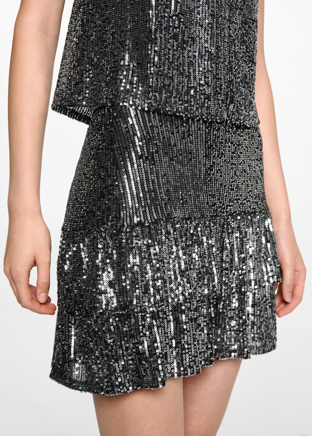 Tanca lateral. Disseny curt. Teixit amb lluentons. Disseny volants. Total look. Col·lecció festa i esdeveniments. Party Collection.