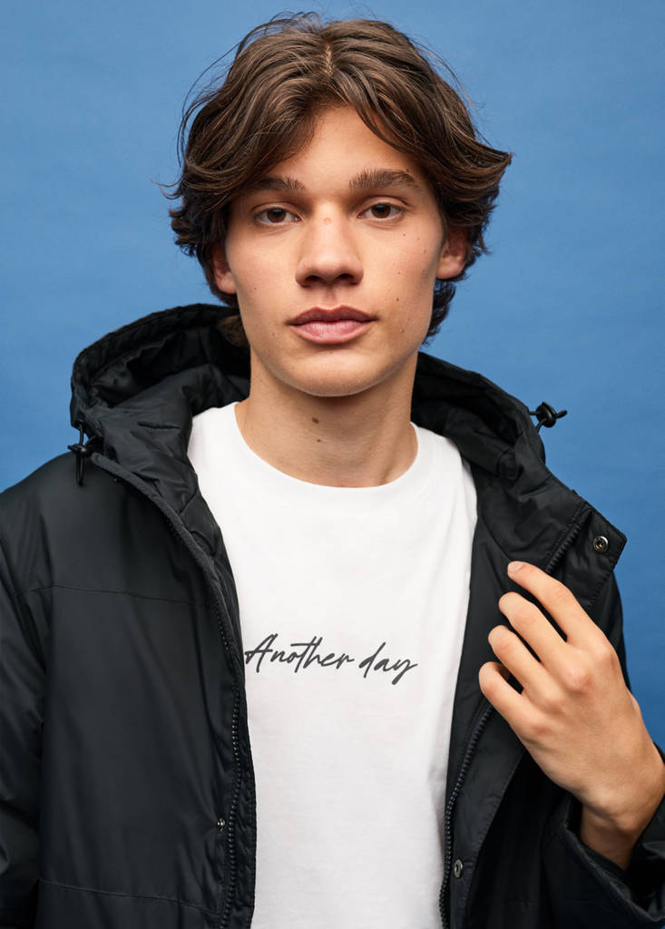 Teixit lleuger. Disseny recte. Disseny estàndard. Disseny embuatat. Màniga llarga. Folre interior. Caputxa. Dues butxaques laterals. Tanca davantera. Tanca de cremallera i botons. El model mesura 175cm i porta la talla M. Col·lecció Teen