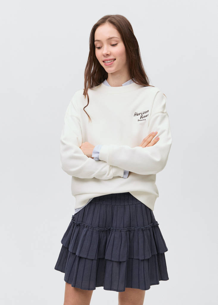 Teixit de cotó. Disseny recte. Missatge estampat al pit. Dibuix estampat amb relleu a la part posterior. Coll rodó. Màniga llarga. Coll, punys i baix de canalé