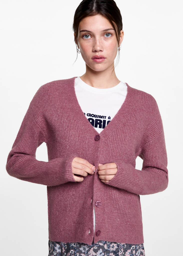 Teixit de punt gruixut. Tanca de botons. Coll en punta. Màniga llarga