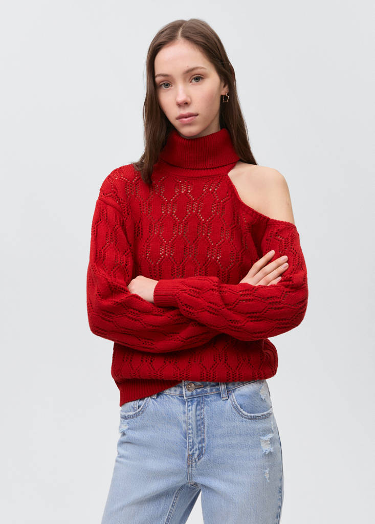 Teixit de cotó. Teixit de punt calat. Coll alt. Cut-out. Espatlla descoberta. Màniga llarga. Punys i vora en rib