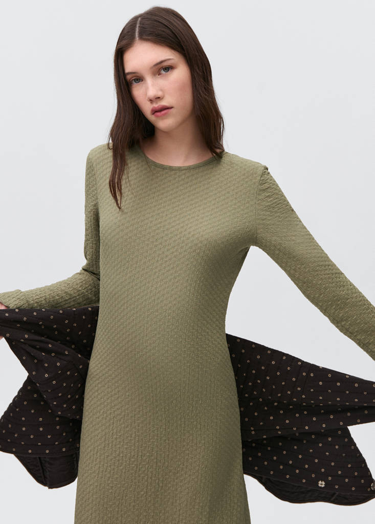 Teixit fluid amb textura. Disseny llarg. Obertura esquena cordill. Escot barca. Màniga llarga. Acabat ondulat