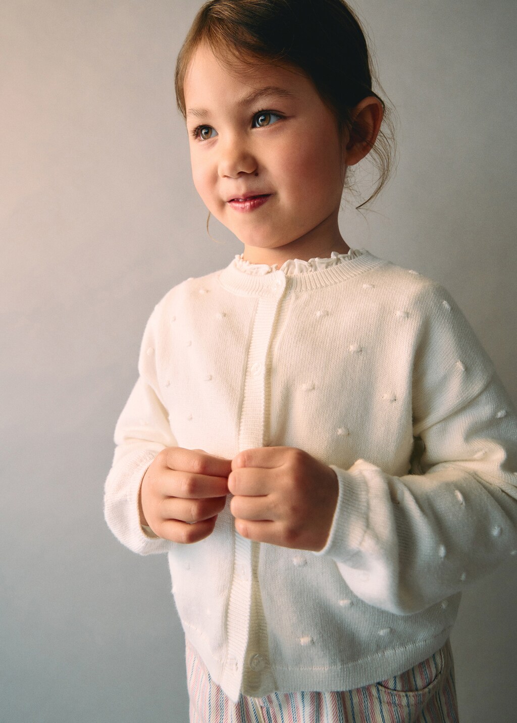 Tejido de algodón. Peto punto bordado. Manga larga. Cuello, puños y bajo en canalé. Cierre delantero con botones.