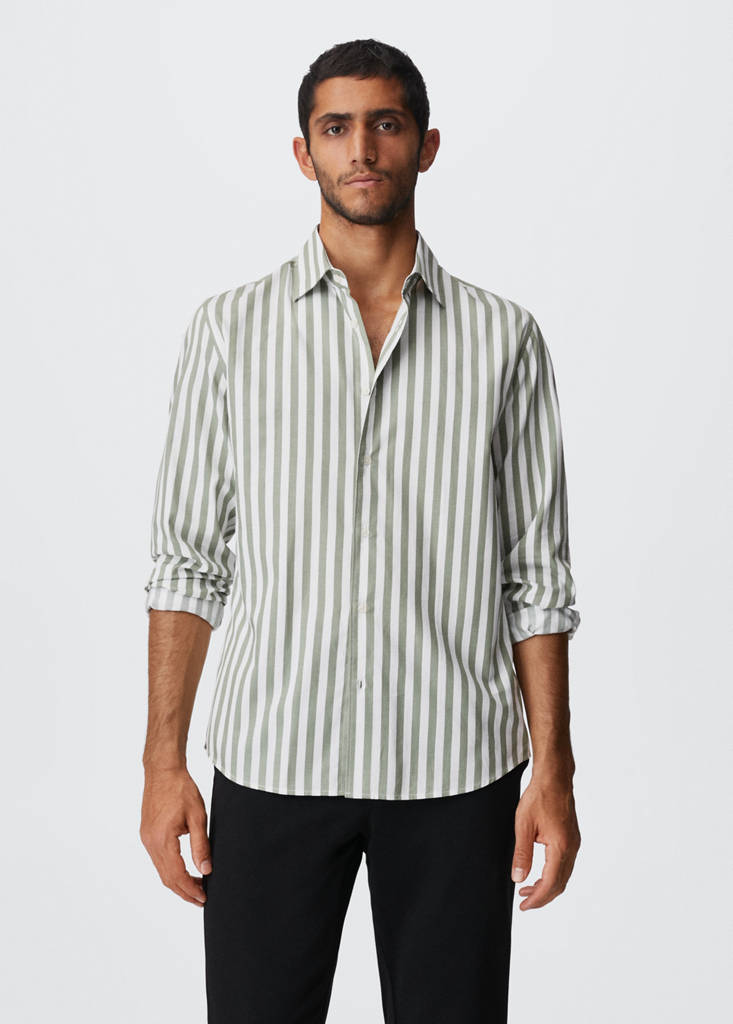 Slim fit. Tejido de rayas. Tejido de algodón sostenible. Cierre de botones. Manga larga. Cuello clásico