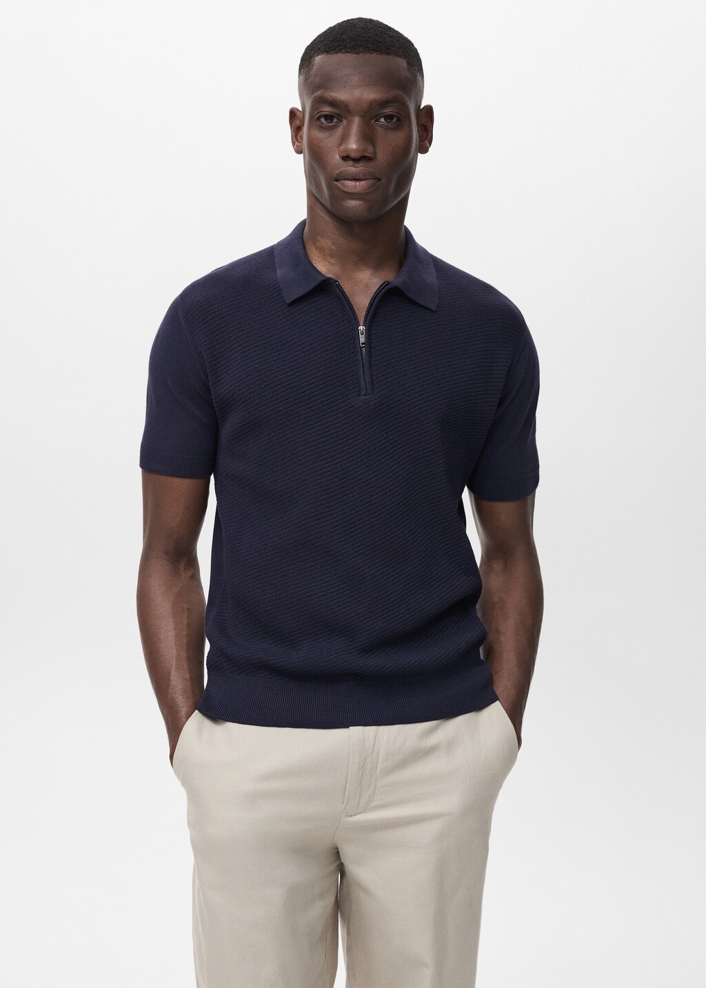 Tejido 100% algodón. Straight fit. Tejido de punto fino con detalles calados. Cuello polo con cierre de cremallera. Punto de mangas a contraste. Cuello, mangas y bajo acabados en canalé.