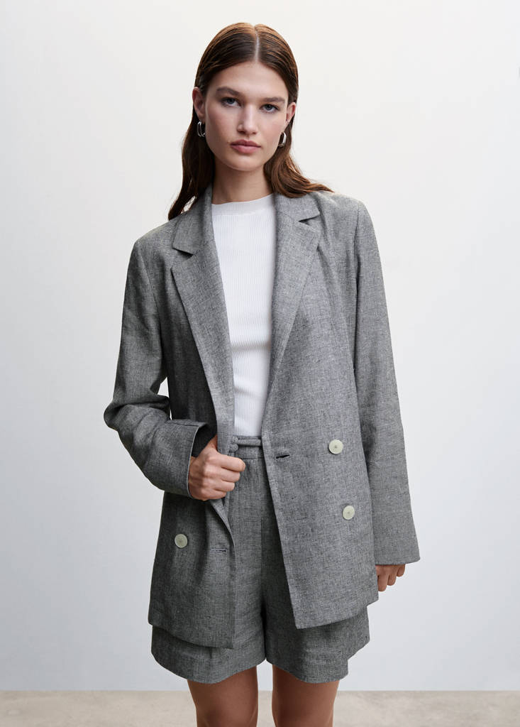 Tejido mezcla de lino. Diseño recto. Cuello pico con solapa. Manga larga. Cierre de doble botonadura. Forro interior. Total look
