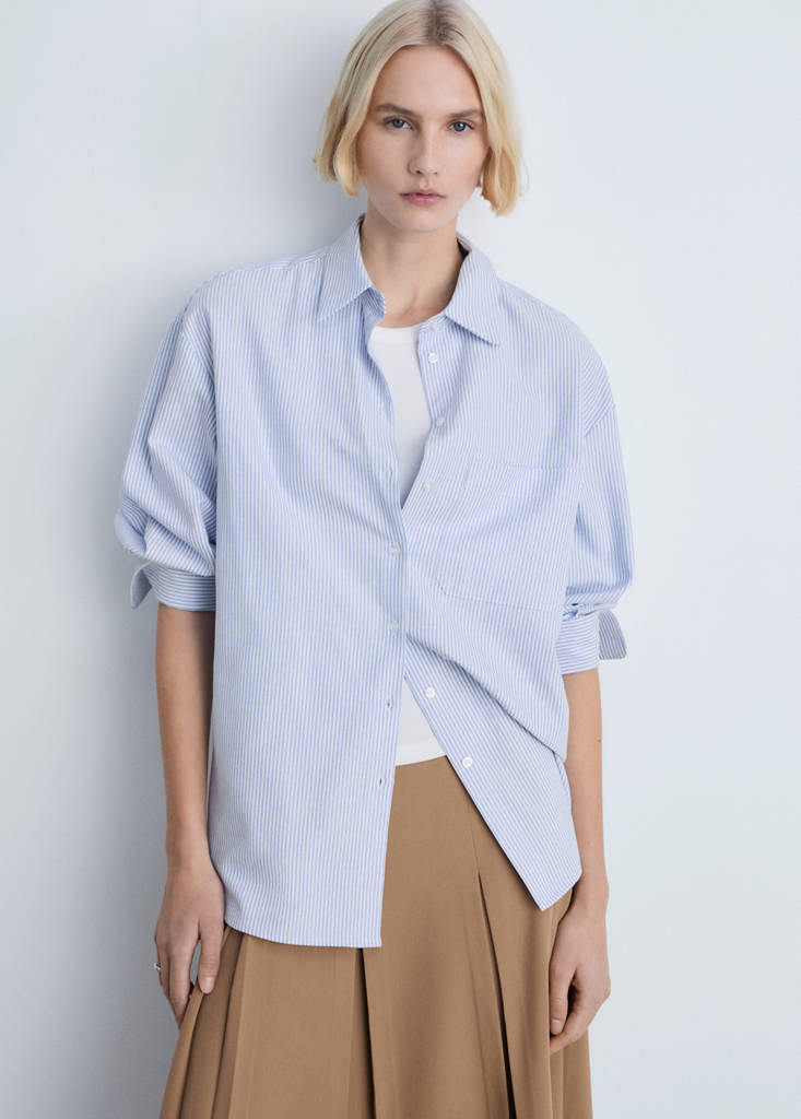 Tejido mezcla de algodón. Diseño recto. Estampado de rayas. Cuello camisero. Manga larga con puños abotonados. Un bolsillo de parche en la parte delantera. Cierre de botones en la parte delantera
