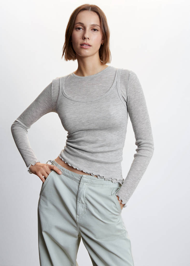 Camiseta combinada topPrecio inicial tachado [€ 18,99 ]€ 18,99Precio actual [€ 12,99 ]€ 12,99-32 %Selecciona un colorGrisLa modelo lleva la talla S y mide 180cm.Selecciona tu tallaSNo disponible ¡Lo quiero!MNo disponible ¡Lo quiero!LNo disponible ¡Lo quiero!MedidasAvísameTejido de punto de canalé. Diseño recto. Top incorporado. Cuello redondo. Manga larga. Sin cierreDetalles, composición y cuidadosDisponibilidad en tienda