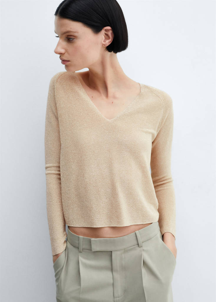 Jersey lúrex cuello picoPrecio inicial tachado [€ 22,99 ]€ 22,99Segundo precio tachado [€ 17,99 ]€ 17,99Precio actual [€ 13,99 ]€ 13,99-39 %Selecciona un colorOroLa modelo lleva la talla S y mide 177cm.Selecciona tu tallaXXSNo disponible ¡Lo quiero!XSNo disponible ¡Lo quiero!SNo disponible ¡Lo quiero!MNo disponible ¡Lo quiero!LNo disponible ¡Lo quiero!XLNo disponible ¡Lo quiero!XXLNo disponible ¡Lo quiero!MedidasAvísameTejido de punto fino. Tejido de lurex. Diseño recto. Cuello pico. Manga larga. Sin cierreDetalles, composición y cuidadosDisponibilidad en tienda