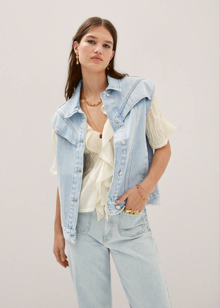 Tejido de algodón estilo tejano vaquero. Diseño oversize. Diseño largo. Cuello camisero. Sin mangas. Cierre de botones en la parte delantera. Festival Season