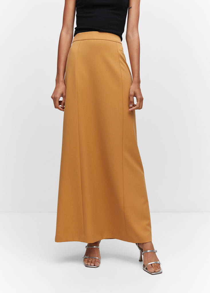 Tejido fluido, diseño largo, diseño evasé, cierre de cremallera invisible en la parte posterior, detalle de pinzas, abertura posterior en el bajo, bolsillo decorativo en la parte posterior, total look, colección fiesta y ceremonia, looks de oficina.