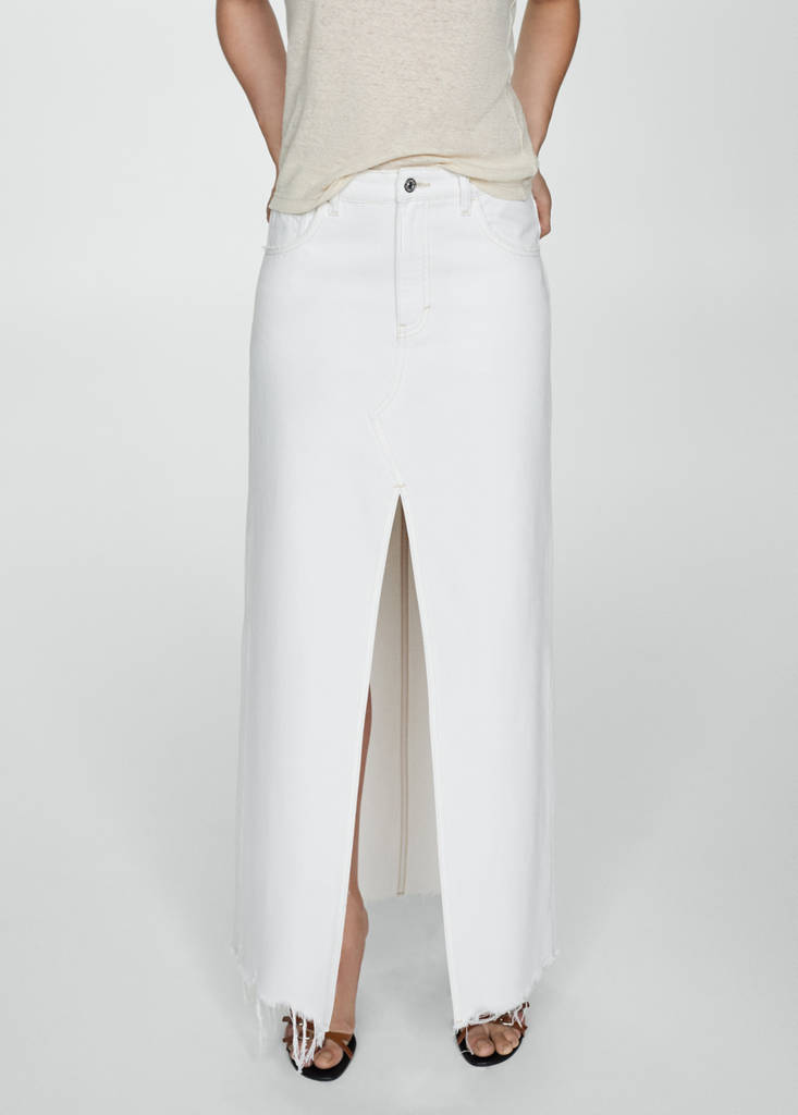 Tejido de algodón estilo tejano vaquero. Tiro alto. Diseño recto. Diseño largo. Dos bolsillos delanteros. Bolsillo portamonedas. Dos bolsillos de parche en la parte posterior. Trabillas. Cierre de cremallera y botón. Abertura en el bajo parte delantera. Bajo deshilachado