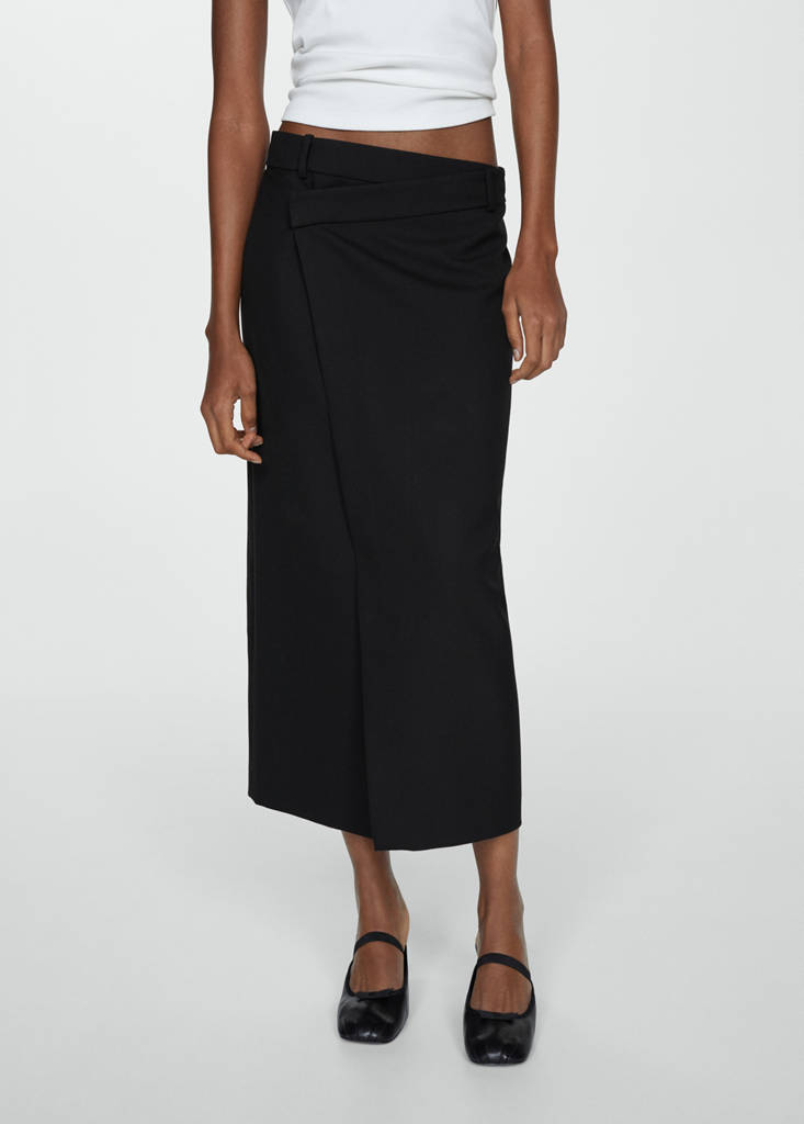 Tejido fluido. Diseño midi. Diseño cruzado. Tiro medio. Trabillas. Cierre de botón lateral. Forro interior. Looks de oficina