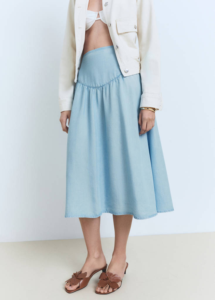 Tejido de lyocell. Soft denim. Diseño midi. Diseño evasé. Tiro alto. Cierre de cremallera en la parte posterior