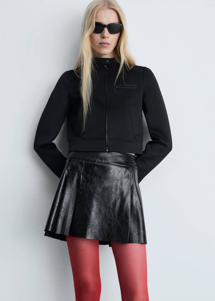Diseño corto. Diseño de tablas. Tiro medio. Cierre de cremallera en la parte posterior. Efecto piel. Diseño evasé