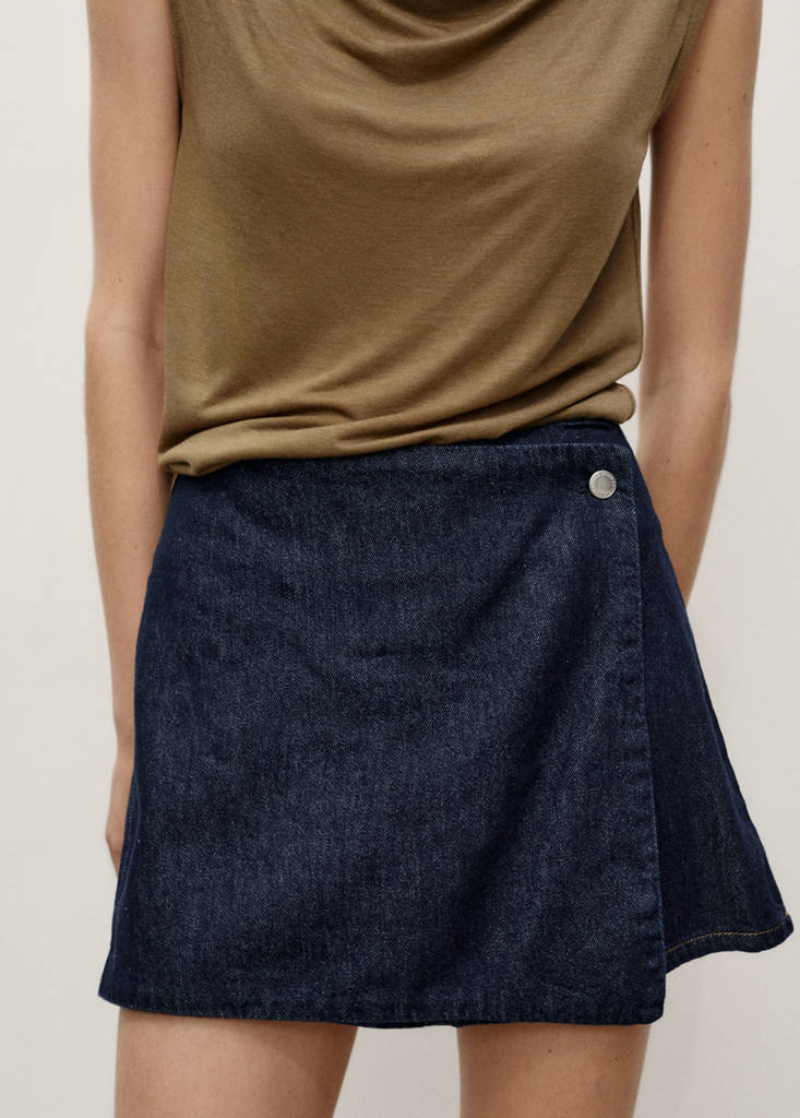 Tejido de algodón estilo tejano vaquero. Diseño falda pantalón. Diseño corto. Diseño recto. Tiro medio. Cierre de botón en la parte delantera