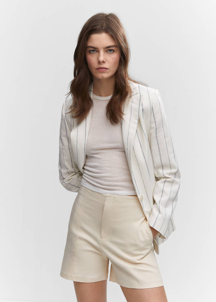 Tejido mezcla de algodón. Diseño recto. Diseño corto. Tiro alto. Dos bolsillos laterales. Cierre oculto de botón, gancho y cremallera. Looks de oficina