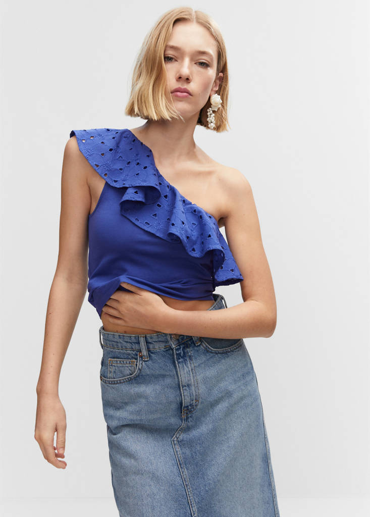 Top asimétrico volante bordadoPrecio inicial tachado [€ 16,99 ]€ 16,99Precio actual [€ 10,99 ]€ 10,99-35 %Selecciona un colorAzulLa modelo lleva la talla S y mide 180cm.Selecciona tu tallaXXSNo disponible ¡Lo quiero!XSNo disponible ¡Lo quiero!SNo disponible ¡Lo quiero!MNo disponible ¡Lo quiero!LNo disponible ¡Lo quiero!XLNo disponible ¡Lo quiero!Avísame100% Algodón. Diseño asimétrico. Diseño recto. Cuello asimétrico. Volante bordado. Tirante ancho. Sin cierreDetalles, composición y cuidadosDisponibilidad en tienda