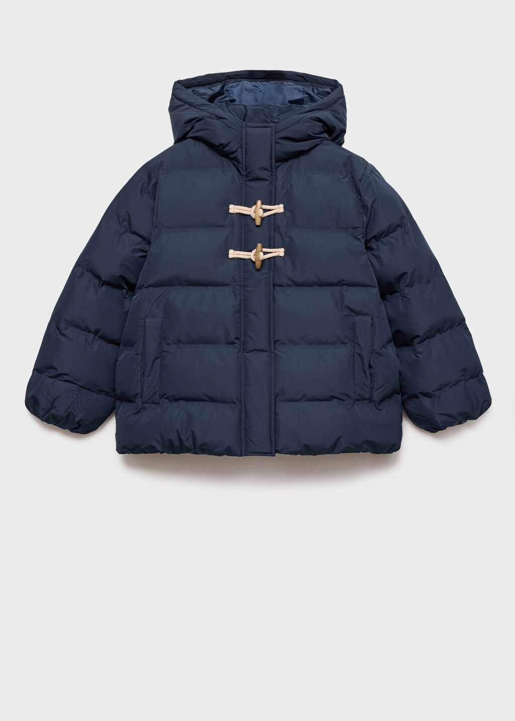 Diseño acolchado. Diseño recto. Cuello alto. Capucha. Manga larga. Dos bolsillos delanteros. Botones efecto madera. Cierre oculto de cremallera y botones a presión.