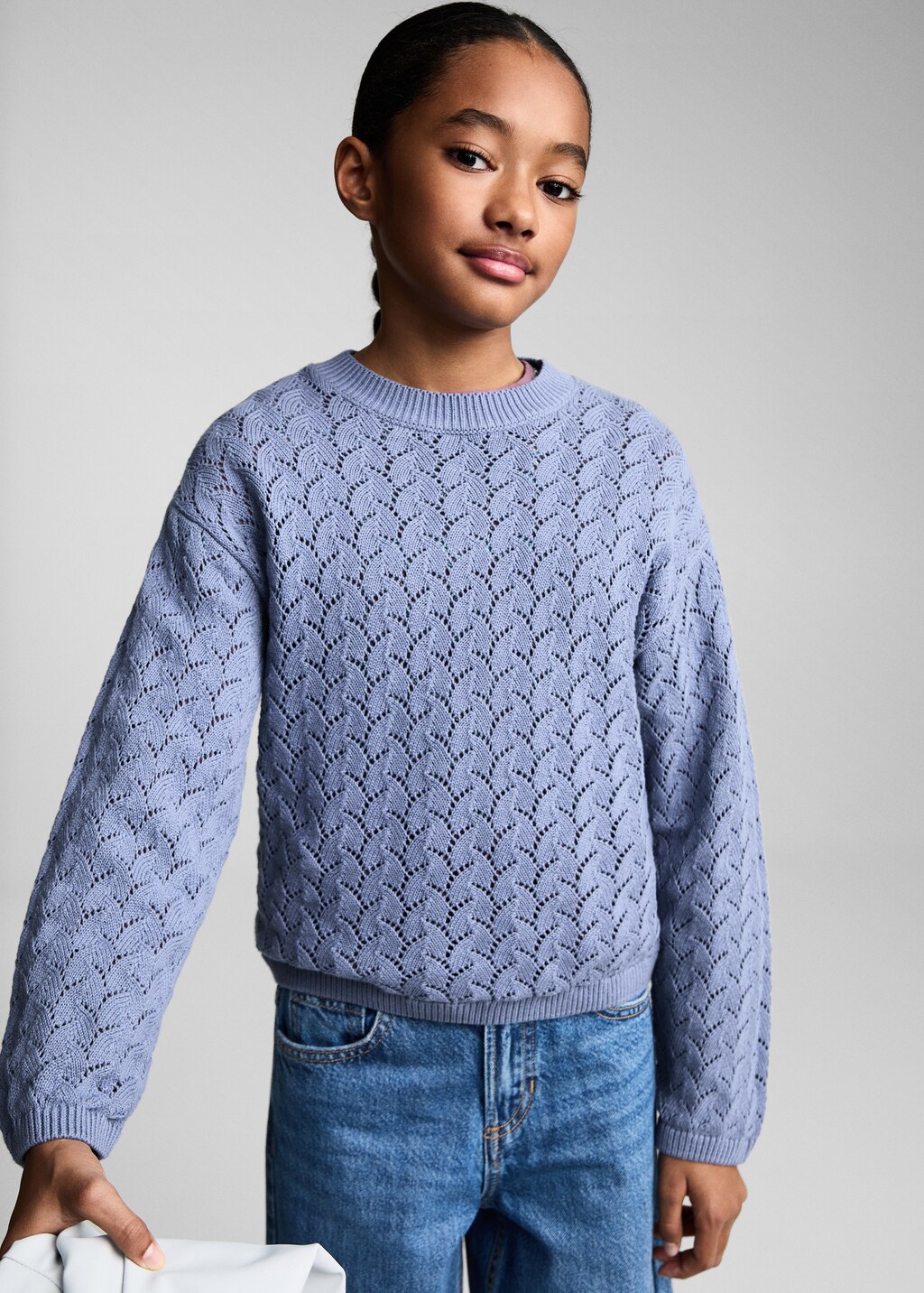 100% Algodón. Tejido de punto calado. Manga larga. Cuello, puños y bajo en canalé.