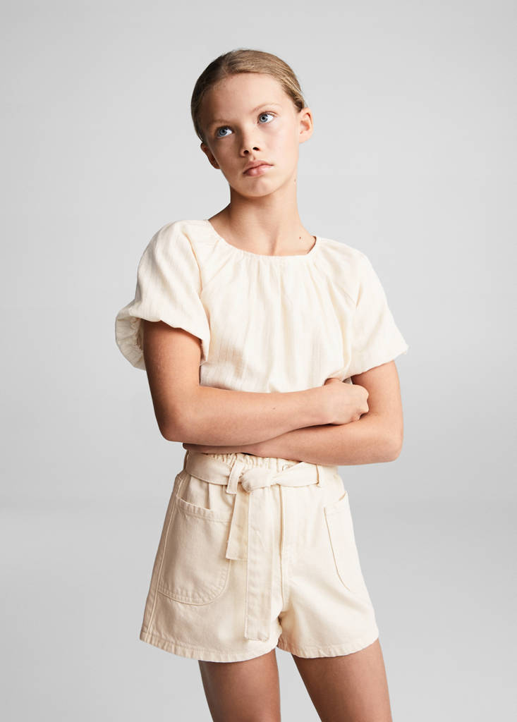 Tejido de algodón. Tejido ligero. Detalle de lúrex. Manga corta. Manga abullonada. Diseño crop. Cierre de botón en la parte posterior