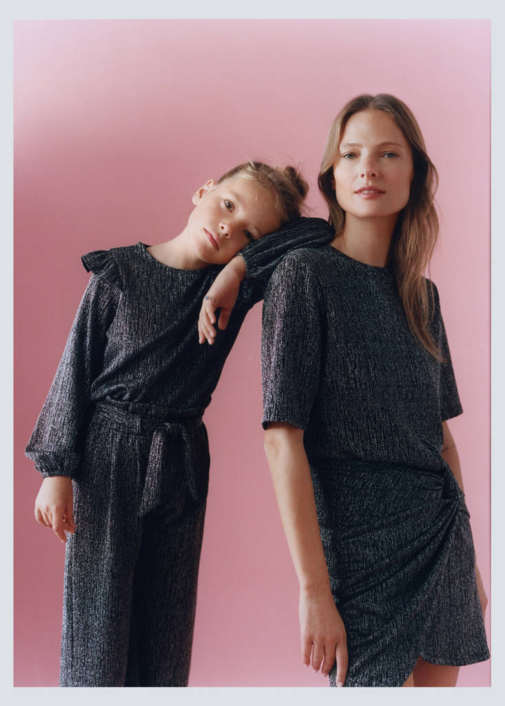 Tejido de lúrex. Diseño recto. Cuello redondo. Manga larga. Detalle de volantes. Cierre de botón. Colección fiesta y ceremonia. Total look