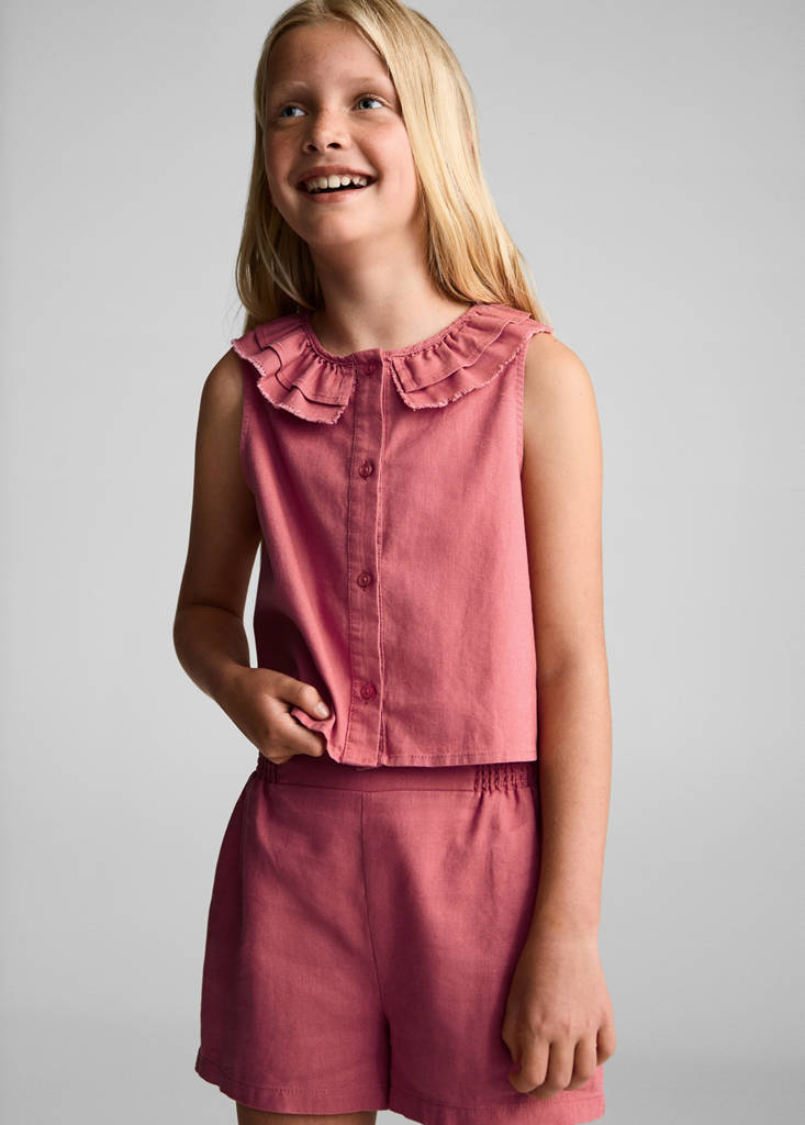 Tejido mezcla de algodón y lino. Detalles fruncidos. Diseño recto. Diseño corto. Cintura con goma elástica. Sin cierre