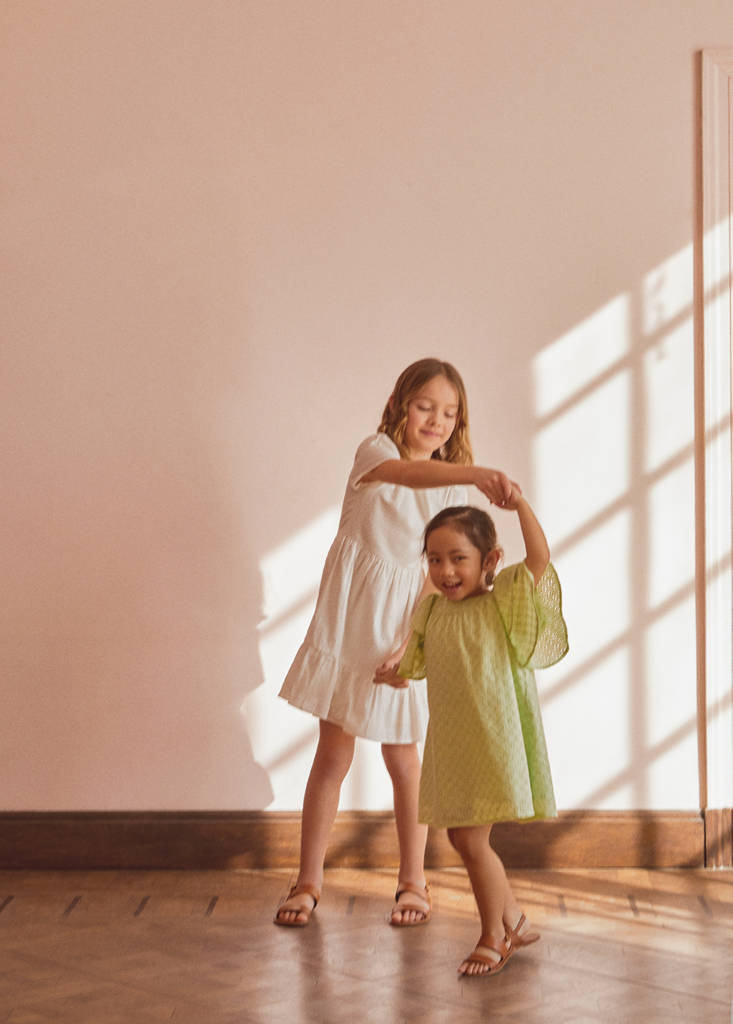 100% algodón. Tejido con textura. Diseño corto. Cuello redondo. Manga corta. Detalle de volante. Abertura en la espalda. Cierre de botones